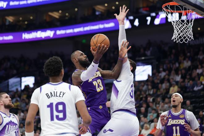 詹姆斯在32分半投篮17中8拿28分7板10助 湖人143-135战胜爵士