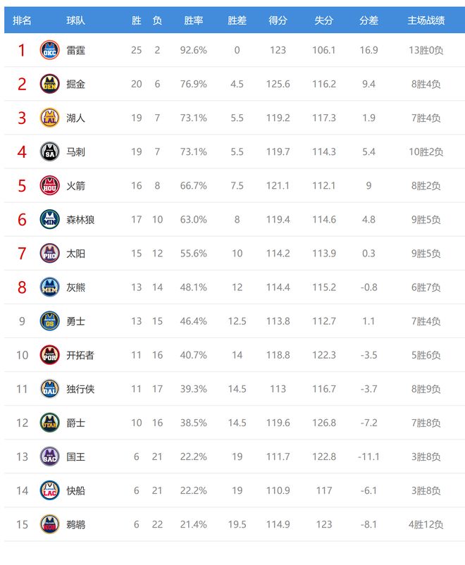 雷霆赢球后25胜2负高居联盟第一,快船输球后5连败,战绩6胜21负排名西部第14。