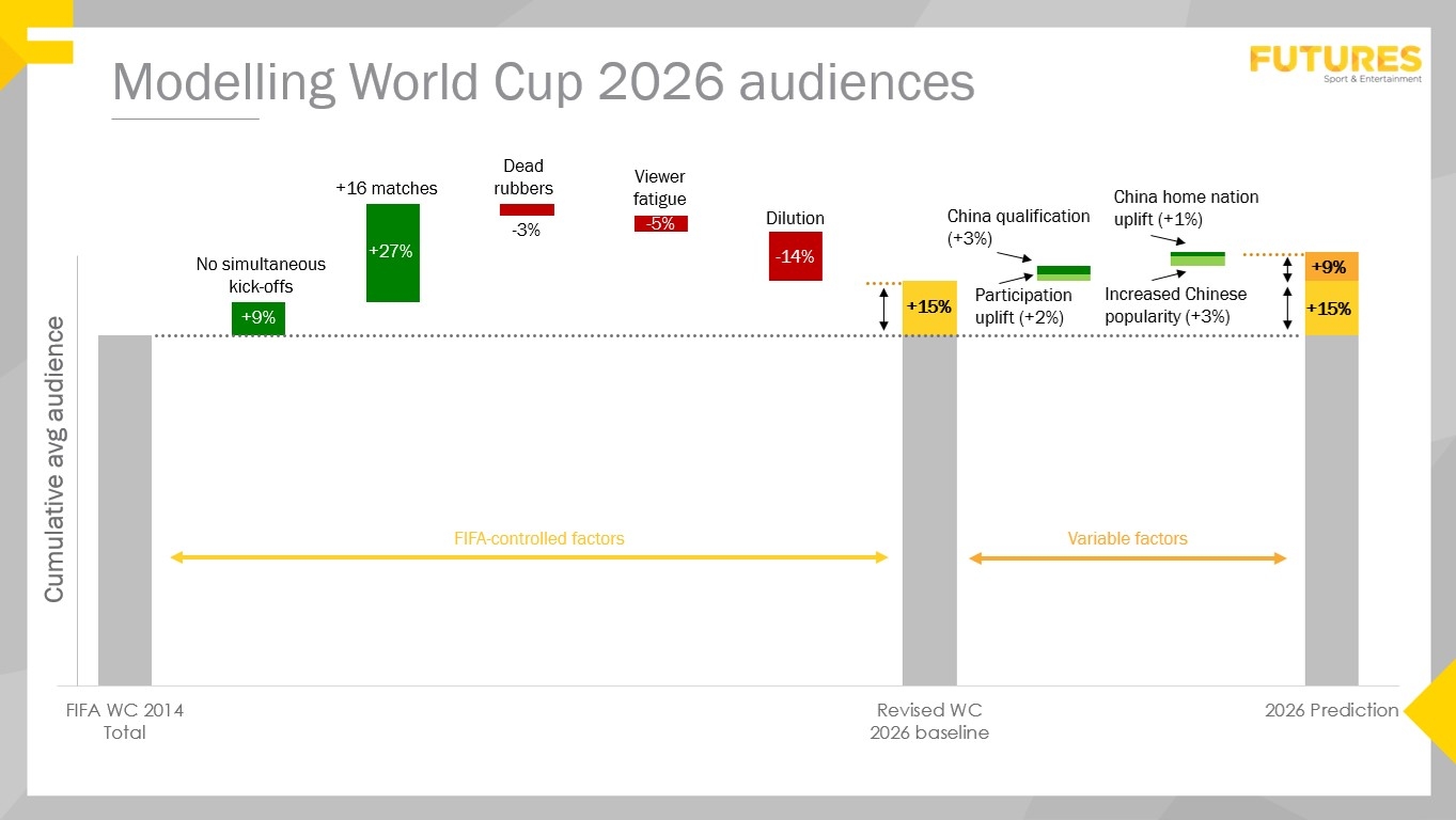 我们对16支扩军球队进行了推测。主要受益者将是亚洲和非洲国家;这两个大洲足联在2026年可能各自拥有9支代表队(相比2014年分别仅有4支和5支)。在此条件下参加世界杯赛事,预计可使相关市场的收视率提升约20%,其中可能包括一些未参加过2014年巴西世界杯的人口大国,如埃及(非洲足联)和土耳其(欧洲足联)。然而,迄今为止对全球收视率影响最大的变量将是中国是否晋级。中国晋级带来的收视提升效应,将超过其余任何15支新晋球队组合的总和。15支球队的市场仅使我们预测的2026年总收视率增长2%,而单单中国晋级即可带来额外3%的增长。